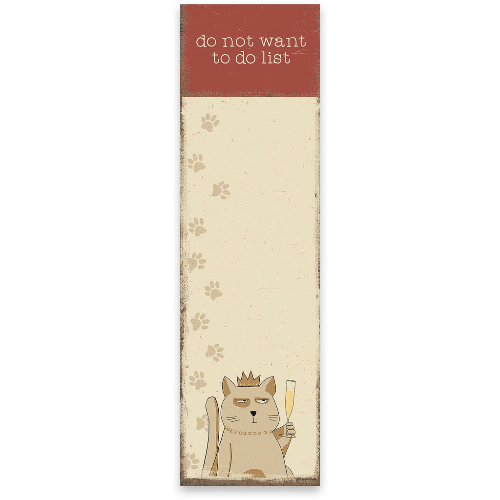 A list notepad from our Pet Collection displaying a rustic pet-themed design featuring a sassy cat with champagne and humorous "Do Not Want To Do List" sentiment. Includes 60 pages and a strong magnet to easily display on magnetic surface. Our Do Not Want To Do List pad is proudly made in the USA. A charming everyday accessory perfect for any space.