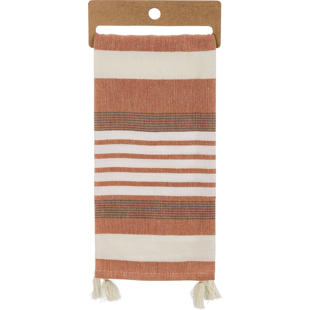 A cotton kitchen towel from our Fall & Harvest Collection features a fall-inspired color palette with embroidered "First We Gobble Then We Wobble" sentiment and woven stripe designs. Includes tassel accents for added interest. Towel is packaged on a cardboard hanger to easily display on rack. Our First We Gobble Then We Wobble kitchen towel is machine washable.