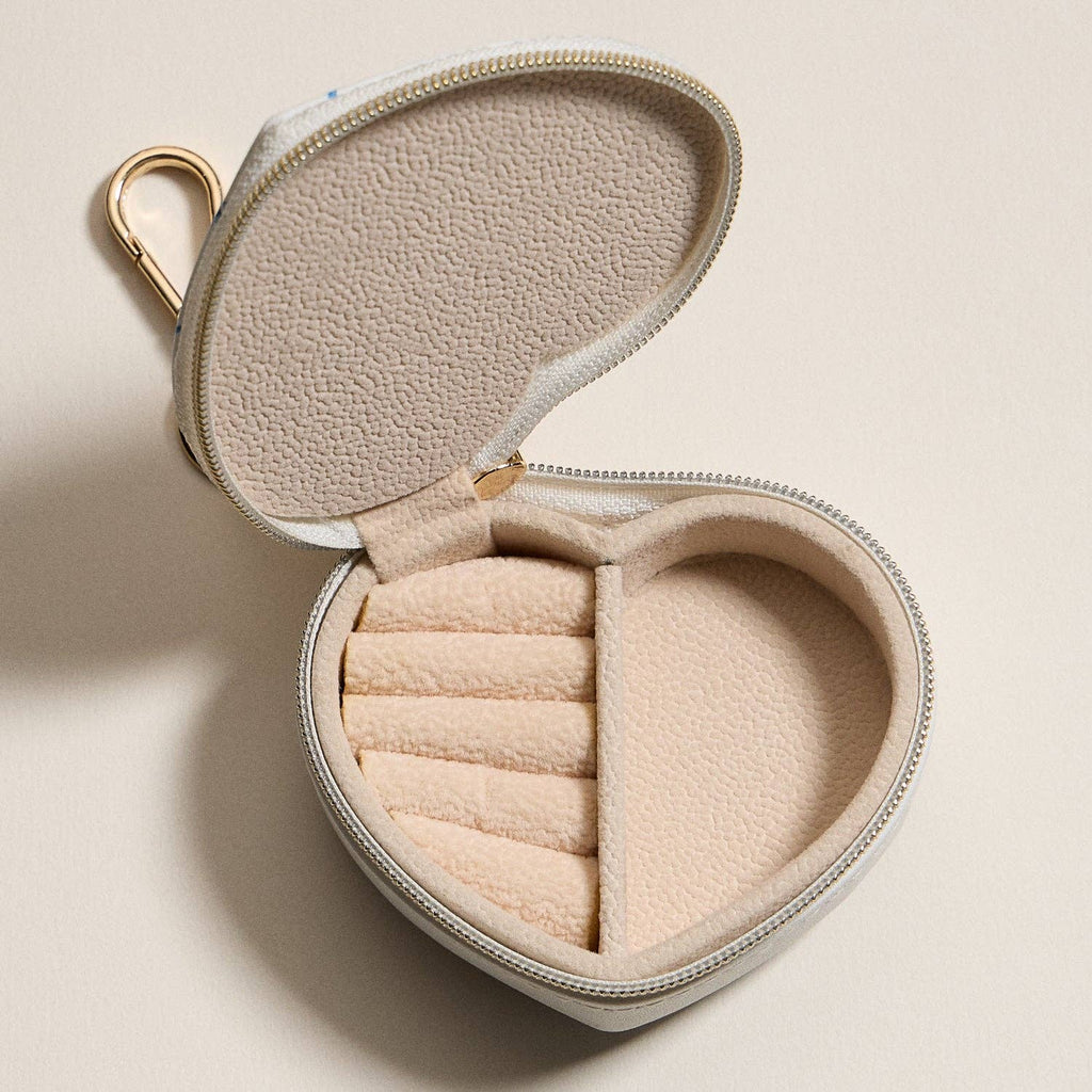 Add elegance to your travels with this heart-shaped jewelry case featuring a delicate blue floral print. Compact yet spacious, it includes a soft velvet interior with ring slots and compartments to keep earrings, rings, and small accessories neatly stored. The secure zipper closure and gold-tone keychain clip make it easy to attach to your handbag or luggage. A stylish and romantic jewelry organizer, perfect for gifting or everyday use.
