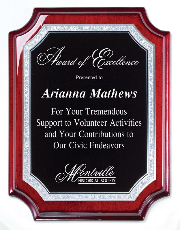 Crafted from premium rosewood with a high-gloss piano finish, this shield-shaped plaque radiates refined elegance. The lustrous surface reflects light with subtle sophistication, while an ornate Florentine-bordered engraving plate adds classical charm. Ideal for honoring accomplishments or preserving cherished memories, this timeless award combines superior craftsmanship with distinguished aesthetics.
