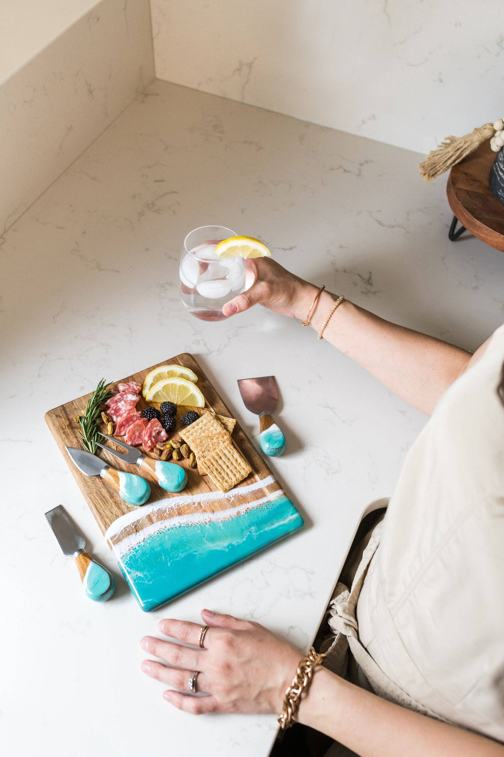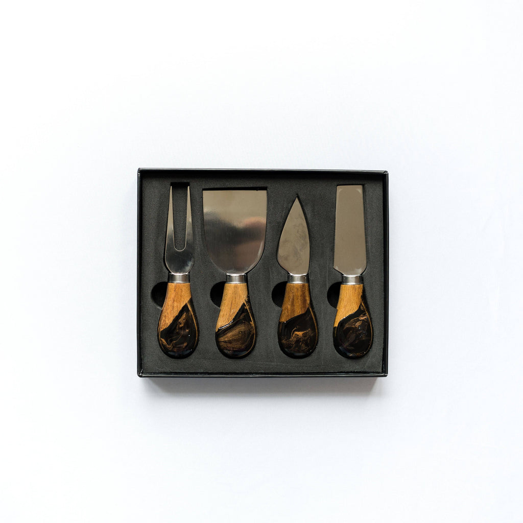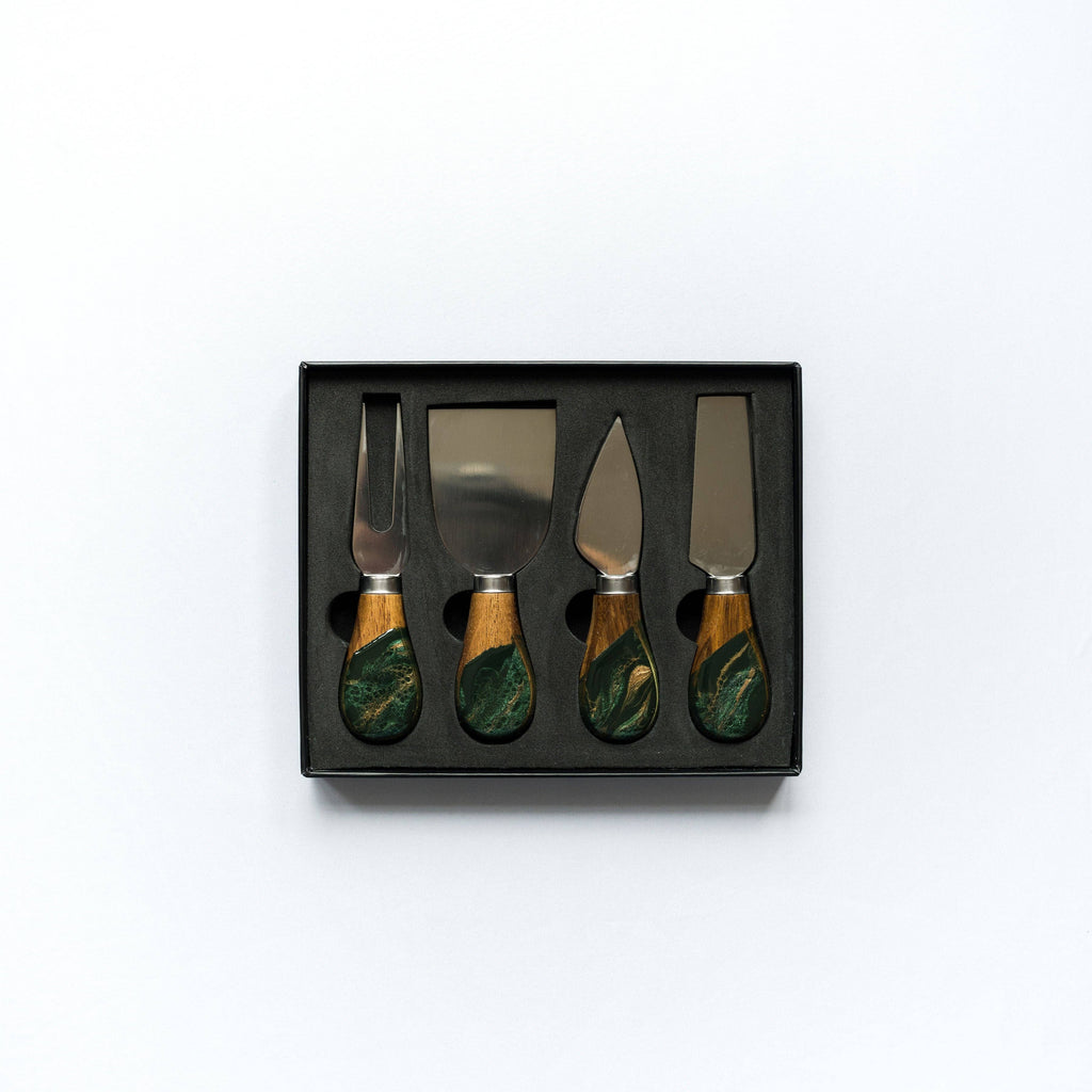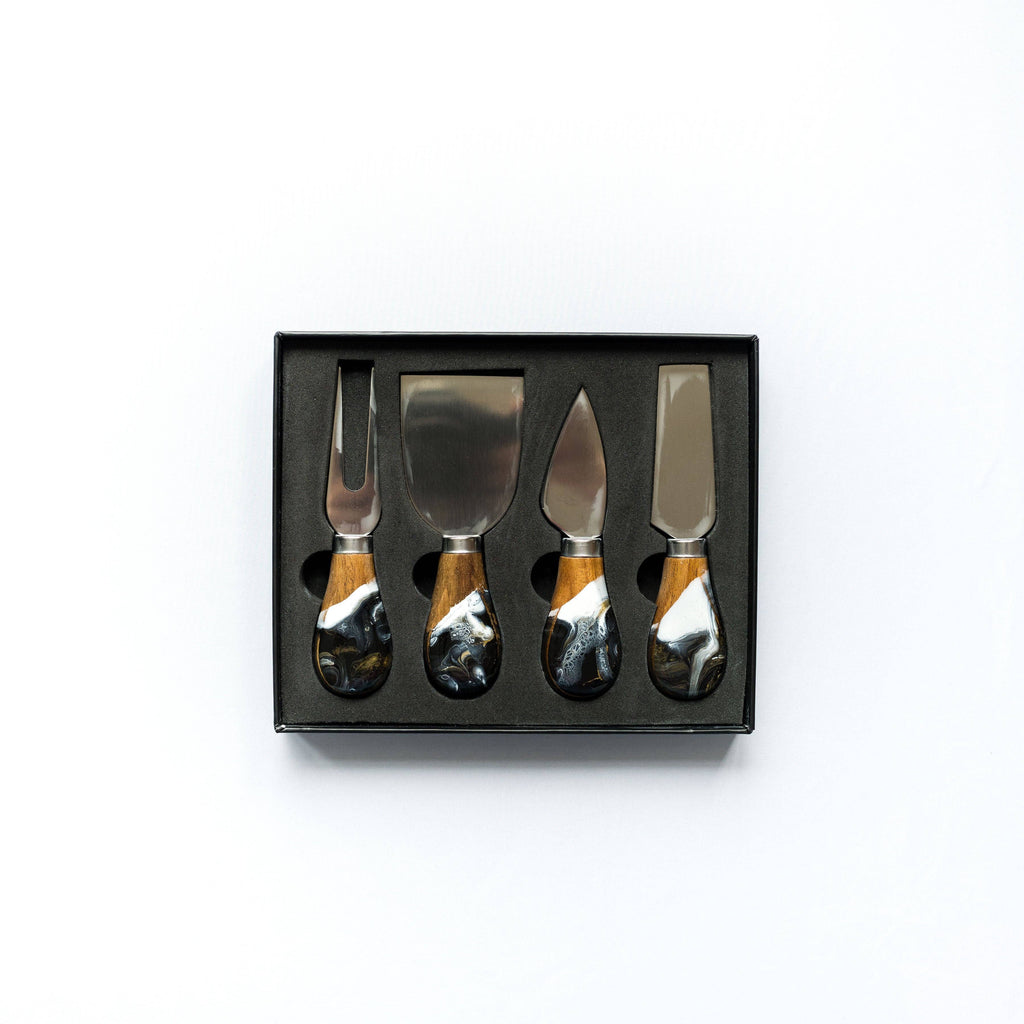 Elevate your entertaining game with our handcrafted Resin-Coated Cheese Knife Set — where premium materials meet artistic flair. Each set includes four high-quality stainless steel cheese knives paired with solid wood handles that are beautifully accented by eco-friendly resin. With four unique color-pattern options, each handle becomes a mini work of art: no two exactly the same.