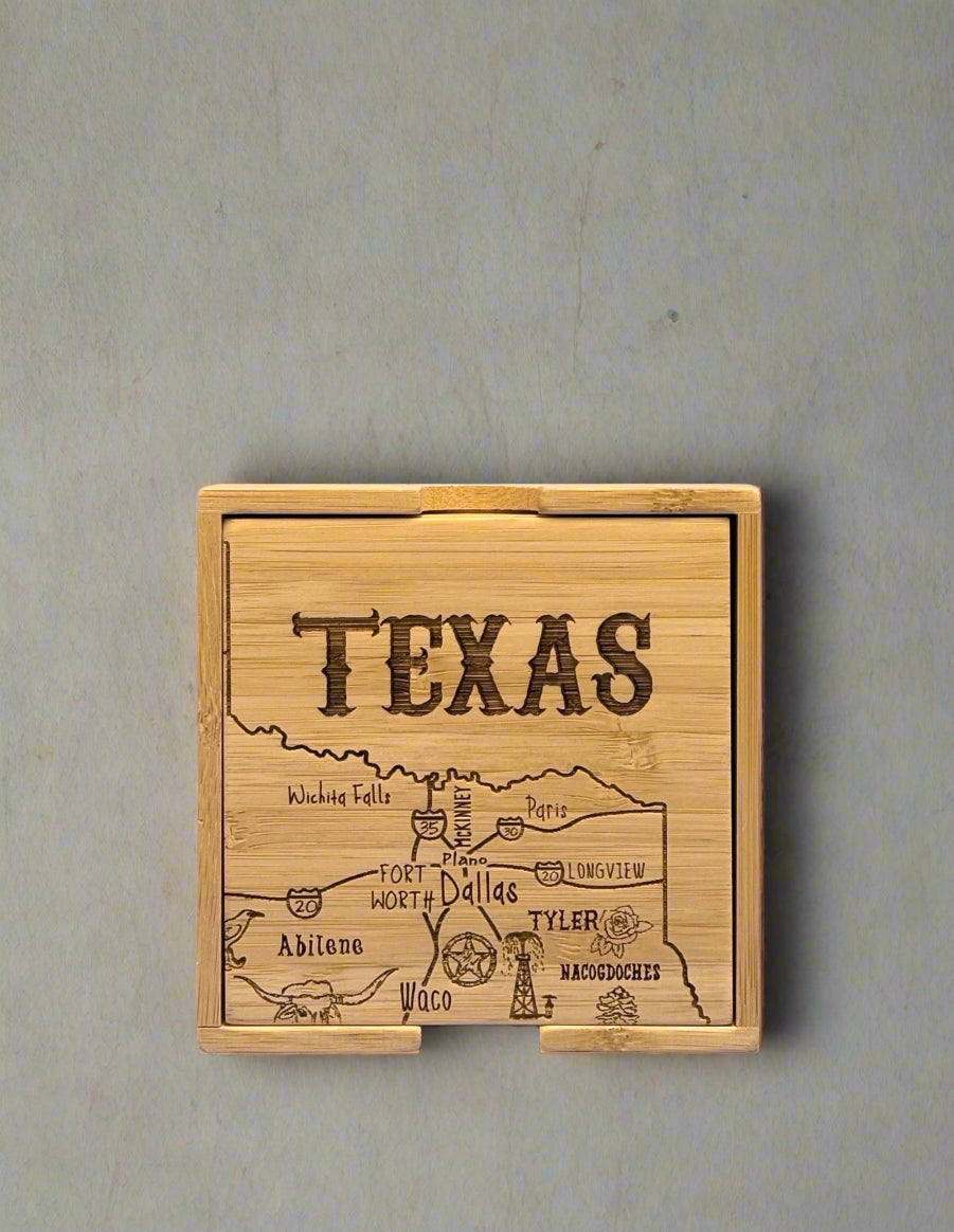 Protect your tabletops with The Totally Bamboo State Puzzle Coaster Set with Case made from sustainable Moso bamboo. Lightweight yet durable, each 4x4 inch coaster fits most glasses and mugs. The set includes a stylish case for easy storage and simple cleaning with a damp cloth. Laser engraving options are available for personalization.